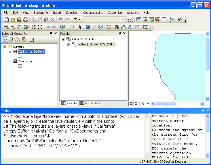 You can see that this is not the prettiest way to look at the code. In just a moment, we'll paste the same code into an IDE and it will be much more readable. Go ahead and press <enter>. This will run the buffer operation again but will produce an error because it is using the same name you just use. Now push the <up arrow> key and you should see the "Buffer_analysis" appear with just it's parameters in parenthesis. Go ahead and change the second "parameter", the file path for the output and then press <enter> again. The buffer operation should complete and place a new, buffered layer, into ArcGIS. You just modified and ran your first Python script in ArcGIS!