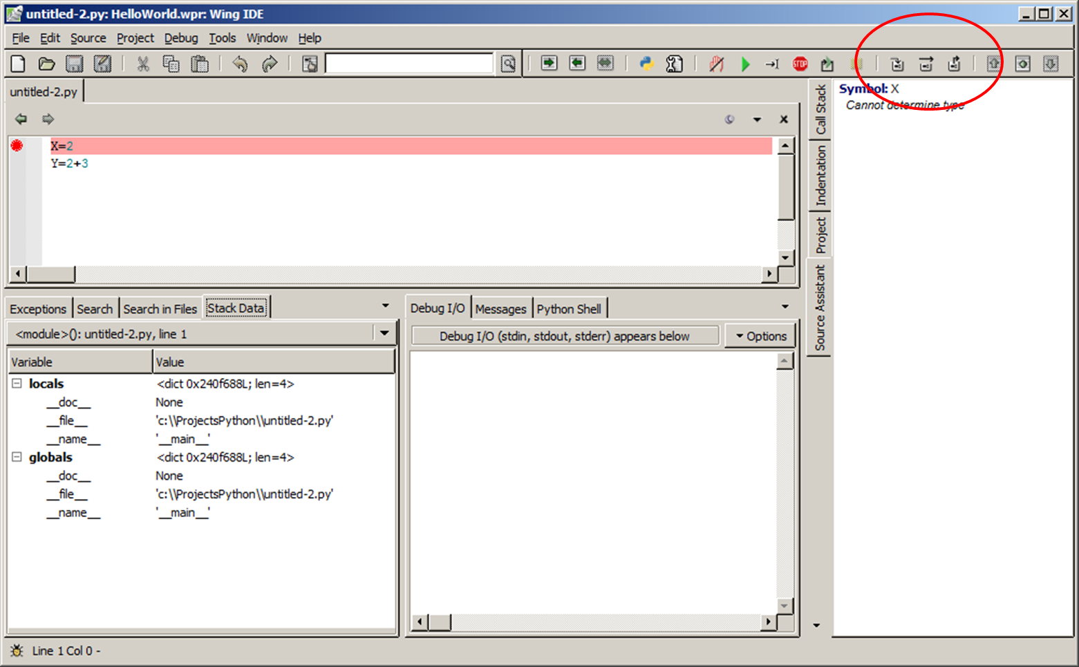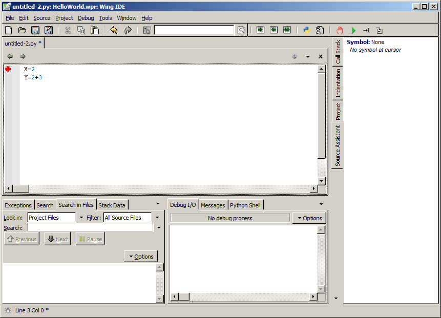 The red bar showing the next line to execute should move down to the next line. This means that Wing has executed one line of your program. Now take a look at the "Stack Data" tab and see if anything has been added. You should see your first variable appear in the "Variable" column on the left and the value you set it to in the "Values" column. Single step again to see the second variable appear and so on.