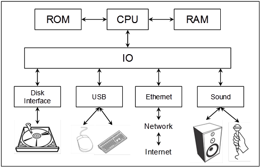 We mentioned that all the CPU can do is read and write to the other components. This is how all the input and output works. If we play a music file the CPU is reading from the music file and writing the data into a music interface which converts the data into electrical signals. These signals make a speaker vibrate which creates sound. Most of the other output devices are actually simpler. When we move a mouse or type on a keyboard the computer receives an interrupt and jumps to a special function that handles the keyboard or mouse input. This input is then read by the current application or the operating system.