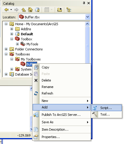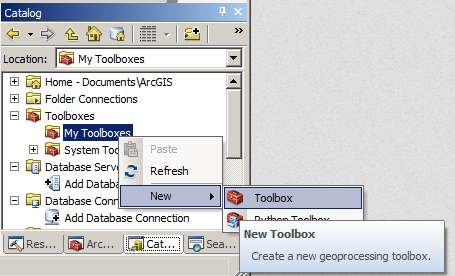 Note: If you want to disribute your tool, DO NOT create it under "My Toolboxes". This folder is in your "Documents and Settings" folder and may be hidden from you. You may not be able to distribute it because you won't be able to find it! Instead, create the tool under a "Folder Connection" to a folder you can easily find.