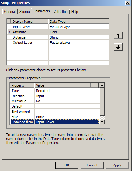 - We need to let ArcMap know which layer to get the attributes from so down in "Parameter Properties" click on "Obtained from" and select "Input Layer". This links our "Input Layer" to the parameter "Attribute".