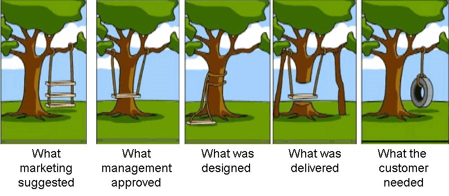 Below is a famous cartoon from Alan Chapman (http://www.businessballs.com/treeswing.htm). While the cartoon is funny, there are a large number of products that fail because of lack of communication, especially between the customer and the development team.