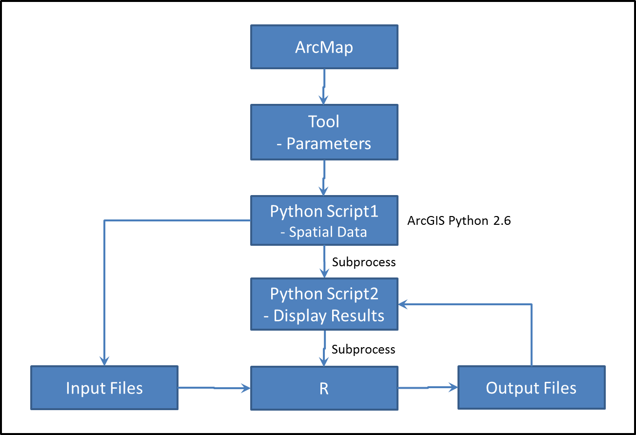 The example below will show you how to create a tool in ArcGIS that sublaunches another Python script that then calls R. Don't worry too much about the R code but you have seen all the Python methods used here during this class.