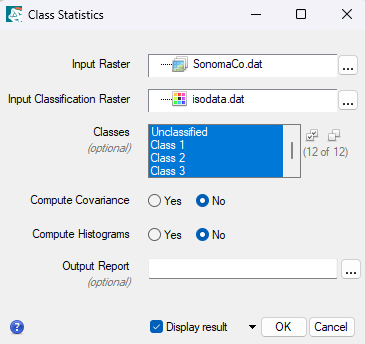 In the Class Statistics Window select the Sentinel-2 mosaic as the Input Raster and select the Isodata classification file and click OK. Under the classes heading, all of the classes. This will compute the statistics from the Sentinel-2 data for each of the classes. Click OK to run the statistics.