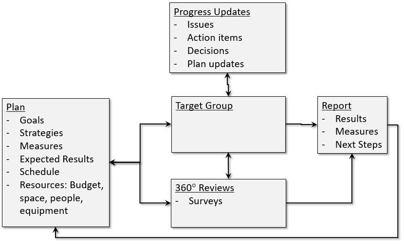 Process management is key to creating efficient and effective organizations. There are a variety of approaches. Key steps any management process are plans, updates, reports, and feedback (Figure 1). Together, these elements combine to assure